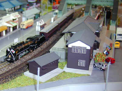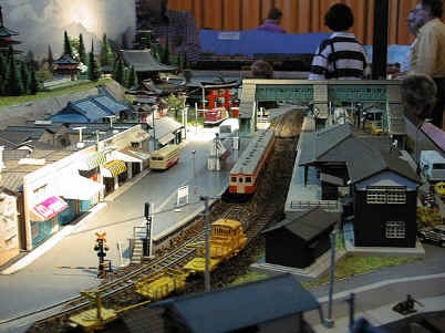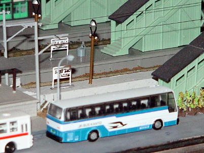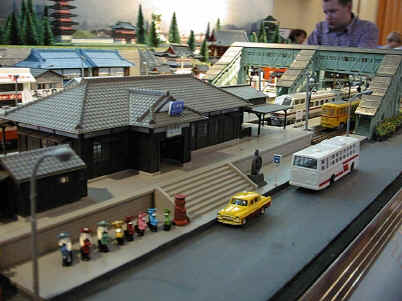Les incontournables du Japon : un taxi, un bus ainsi que les vélos et mobylettes. En gare latérale, une motrice de tram pour le service local et une automotrice pour le service interurbain. ![]() |