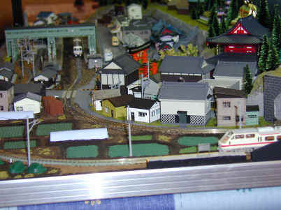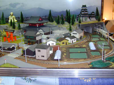 A l'avant-plan, la ligne interurbaine et des cultures. Puis la ligne de train, un quartier résidentiel et, à l'arrière-plan, le sanctuaire shinto. ![]() |