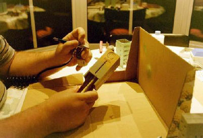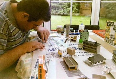 Le webmaster et son aérographe occupé a peindre un immeuble en kit de la marque GM.(08-2002) |