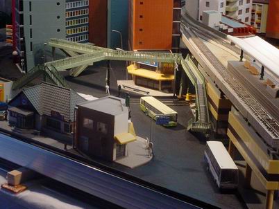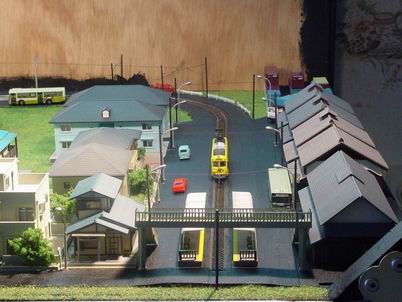 Le plan de la ville permettant une exploitation train (en gare surélevée) et tram (en rue) avec un terminus à la Japonaise en cul de sac. ![]() |