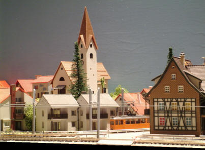 La KSW passe devant les habitations modernes au pied de l'église. |