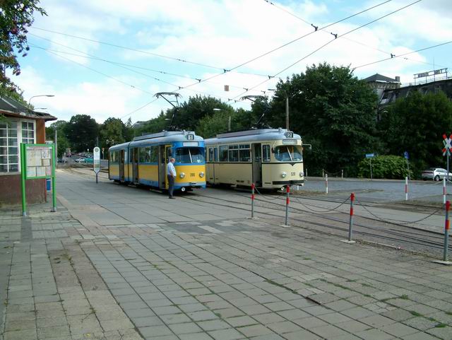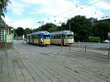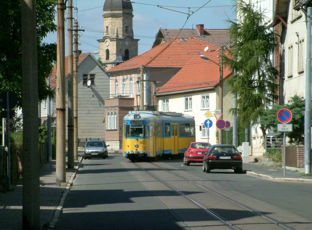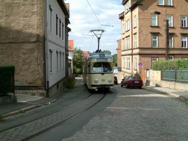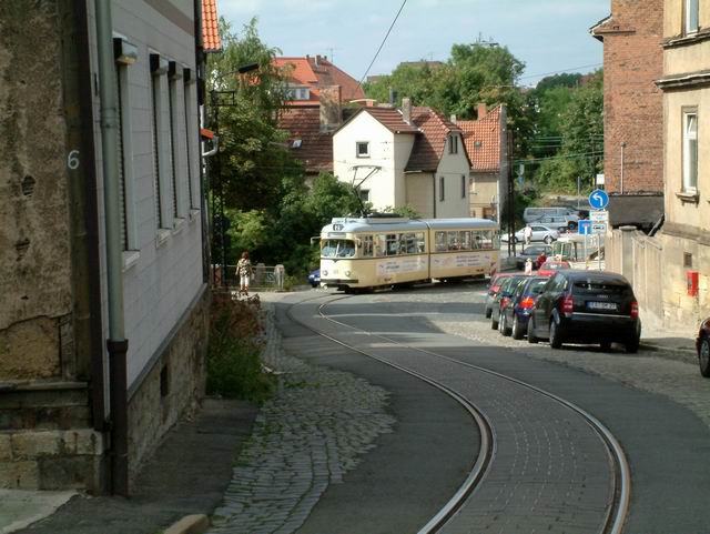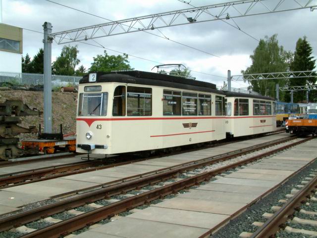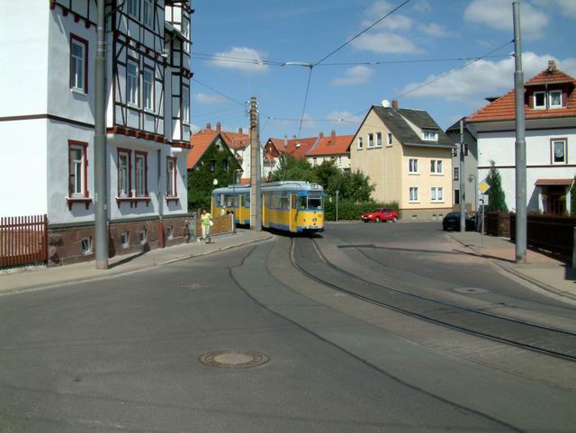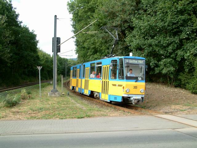 Elektrizitätswerk und Straßenbahn Gotha AG exploite 9 lignes. La construction du Thüringerwaldbahn commence en 1914 mais sera interrompue par la guerre et l’inflation galopante du moment. Ce n’est qu’en 1928 que les travaux reprennent. La ligne sera finalement ouverte entre Gotha et Tabarz en 1929. Le matériel alors affecté à la ligne est au nombre de 10 motrices, 7 remorques et 4 fourgons à bagage. Depuis, la ligne n’a fait que se moderniser et le matériel a suivi cette évolution, par réhabilitation de matériel dans les ateliers locaux ou que d’achat de matériel d’occasion venant de l’ouest ou même de Erfurt. Pour ce qui est du réseau de tram, le centre ville n’est plus desservi depuis fort longtemps. Cependant, les lignes 1 et 4 en font le tour, ce qui permet une visite facile du centre historique. Si le réseau de tram vaut le détour (spécialement la ligne 4), il ne faut pas dédaigner le côté touristique et architectural de cette petite ville bien agréable et relativement préservée des flots de touristes. |